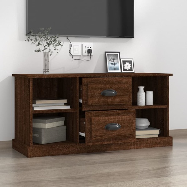 Featuring a stylish yet practical design, this TV cabinet is meant to become a focal point of your room. Durable material: The engineered wood is of exceptional quality with smooth surface and also features strength, stability, and resistance to moisture.Ample storage space: Equipped with 4 open compartments and 2 drawers, the TV stand offers ample storage space to keep all your magazines, DVDs and any other items well organised.Sturdy top: The top of the TV unit provides a secure surface to display decorative objects, photo frames, or potted plants. Good to know:To make assembly as easy as possible, each product is delivered with a manual.