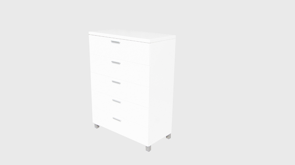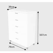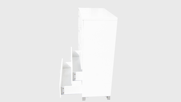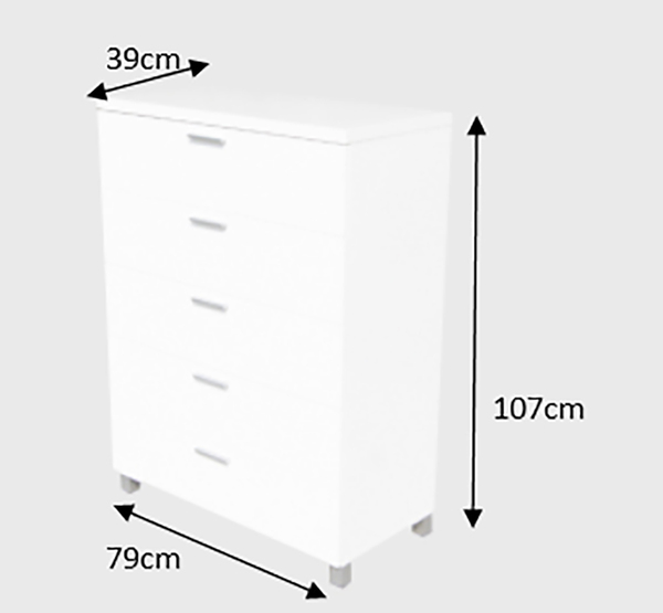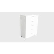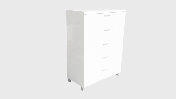 "Elisha High Gloss 5 Drawer Tallboy Chest - White Top Panel is 30mm Laminated with High Gloss Side Panels are 15mm Particle Board Laminated with High Gloss All Other Panels are 15mm & 12mm Particle Board Plastic Legs Mail Order Packaging with Double Wall Thickness