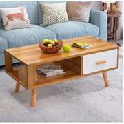 The coffee table has white sliding drawers which combine storage with style. This rectangular coffee table features chic Scandinavian style solid wood legs, and complements the natural coffee table top cabinet. The coffee table is the perfect furniture addition for any living room looking to create a contemporary modern feel.