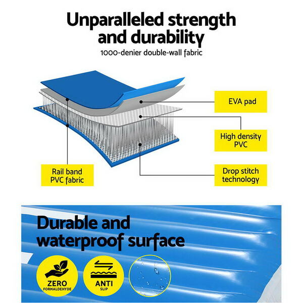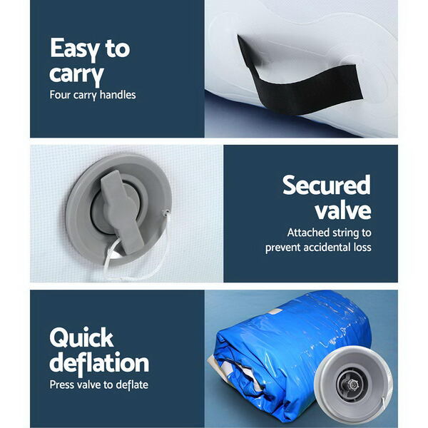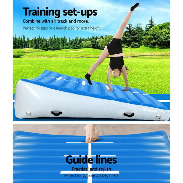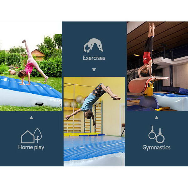 The Everfit inflatable Air Ramp is a great training and launching platform that ensures safe and durable use. It can be used on its own or create various training set-ups with the air track. Softer on the body than foam, the air ramp is also bouncy and highly versatile. Use it to practise the basics of flips or as a punch pad for extra height. It features 1000-denier double-wall fabric construction with an anti-slip and wear-resistant surface. Designed for robust use, the air ramp does not twist or bend with constant handling and helps to reduce impact readily and significantly. Great for gymnastics, cheerleading, martial arts and other activities, the air ramp comes with a built-in valve for easy inflating and deflating. Also included is a bonus carry bag and repair kit.