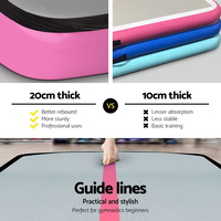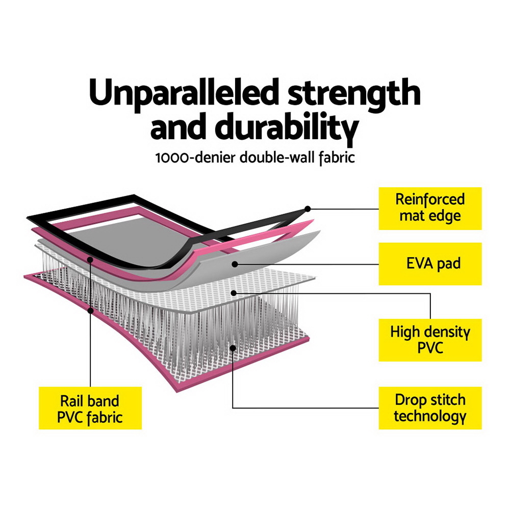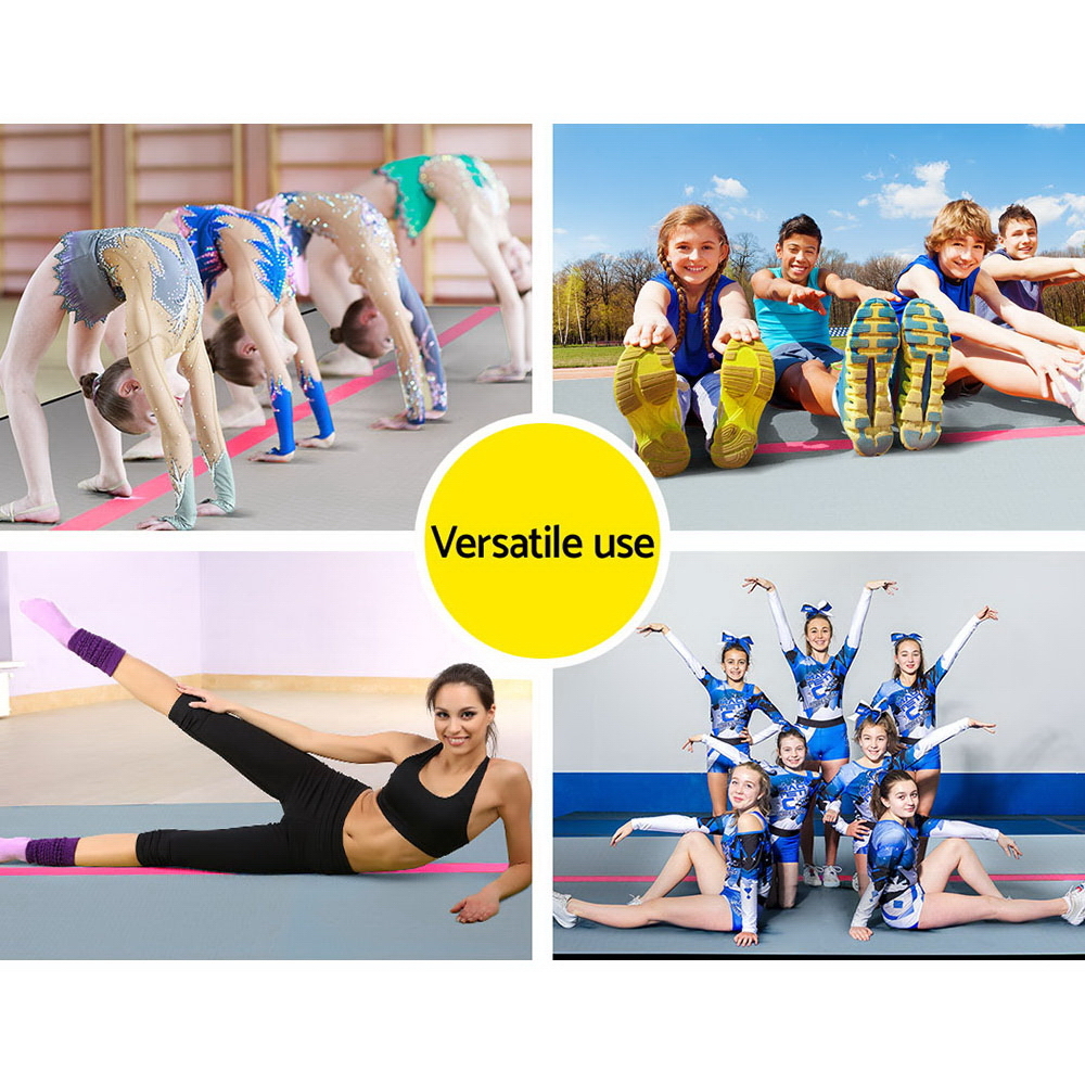 Perfect for gymnastics, cheerleading, martial arts and other school sports, our Everfit inflatable Air Track Mat is a great training and competition landing platform that ensures safe and durable use. Softer on the body than foam, the 20cm thick air track mat is also bouncier than a spring floor and highly versatile. It features 1000-denier double-wall fabric construction with an anti-slip and wear-resistant surface. Designed for robust use, the air track does not twist or bend with constant handling and helps to reduce impact readily and significantly. Great for indoor or outdoor use, the 6m air track mat comes with four carry handles and a built-in valve for easy inflating and deflating. Also included is a bonus carry bag and repair kit.