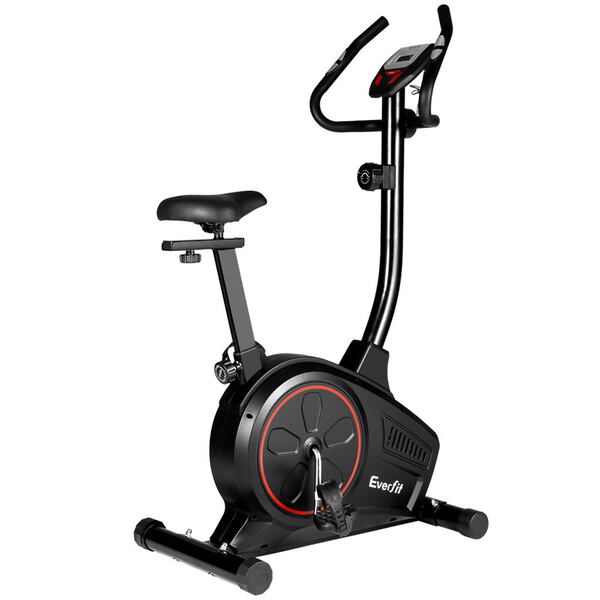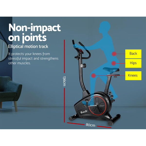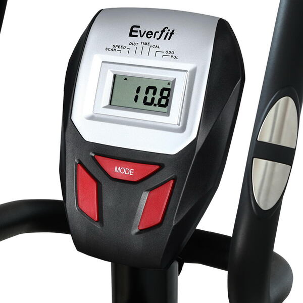 Our Everfit Exercise Bike is a very efficient low-impact cross trainer that offers eight adjustable belt resistance levels to tone every muscle in your body. The easy-to-read LCD display with a single function button lets you keep track of your training parameters in terms of time, speed, pulse, distance and calories. The durable powder-coated steel frame is strong and sturdy and the wide saddle seat is comfortable with every stride. Other great features anti-slip pedals with adjustable straps, steady-grip handle bars and adjustable seat height. Not least, the exercise bike is also portable and allows training in any space and any time.