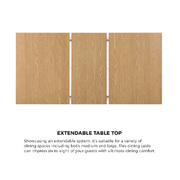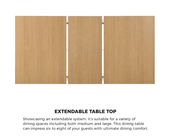 The accompanying extendable dining table is more than just a surface for meals; it's a focal point for your dining room. Designed with practicality in mind, it offers ample space for feasts and gatherings while seamlessly adjusting to your hosting needs. Fostering an environment where connections are made, and memories are created, our set brings versatility to your dining space.