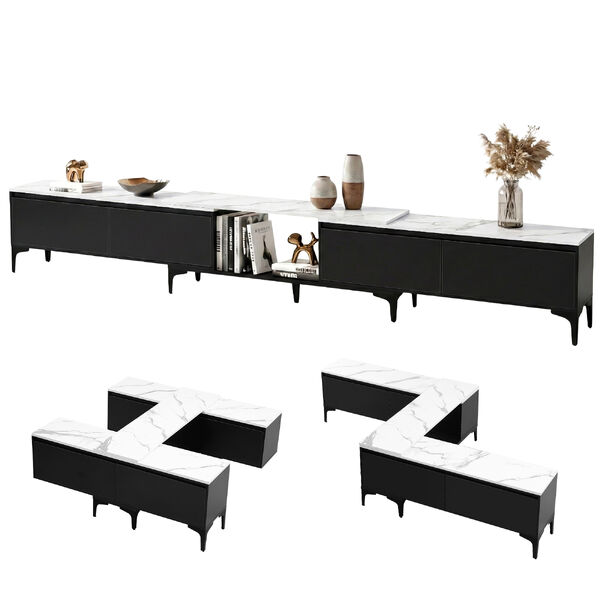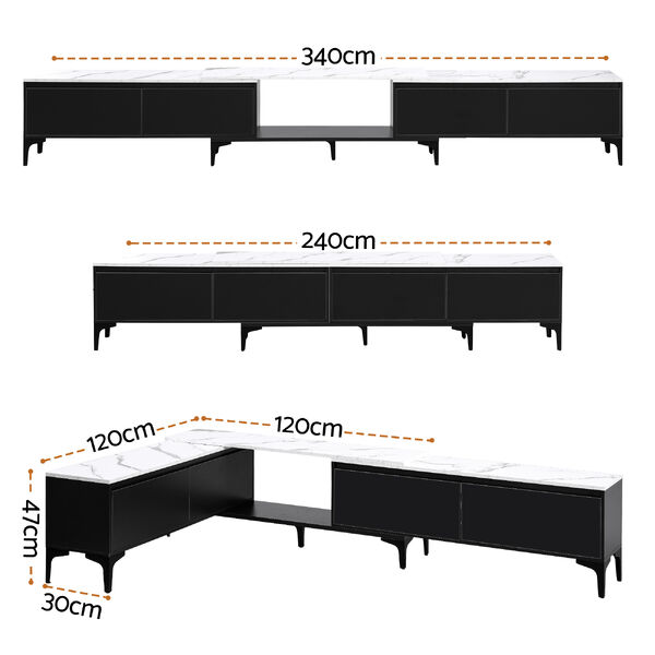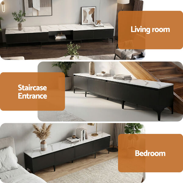Meet the Extendable TV Unit, the smart and adaptable centrepiece for your Australian lounge room. This versatile entertainment cabinet solves the common dilemma of furniture that never quite fits, featuring a fully adjustable length from 240cm to 340cm to perfectly match your wall space, television size, and home theatre setup. Its sleek, handleless design delivers a clean, contemporary look, while four integrated drawers with smooth-gliding metal runners offer discreet, organised storage for all your media essentials, each supporting up to 10kg. The spacious and hard-wearing marble-effect tabletop provides a robust surface for your large-screen TV and components, with a high 80kg weight capacity for total peace of mind. Supported by nine sturdy metal legs for exceptional stability, this unit is designed for both style and safety in active homes. More than just a TV cabinet, its versatile low-profile design also makes it an ideal modern console or coffee table alternative. Easy to assemble and built to last, it's the ultimate functional upgrade for your living or entertainment space.