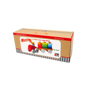 A multiplay wooden farm tractor. Each tractor is nicely made and designed and painted with non toxic paint. Kids will have hours of fun playing while learning about colours and shapes. This toy helps with motor skills.