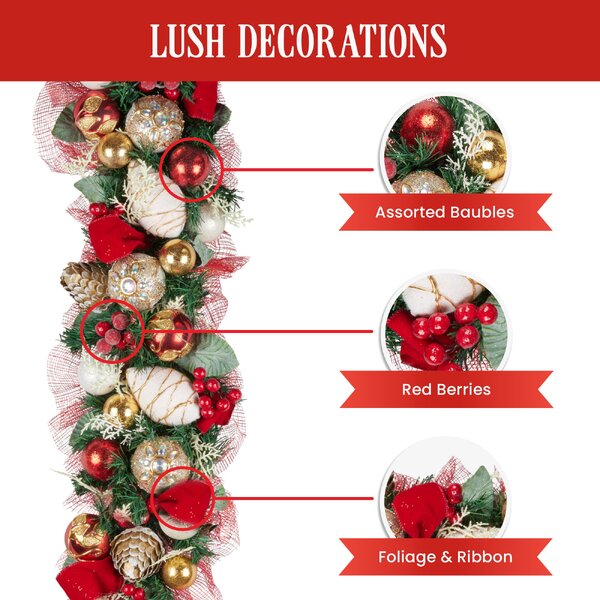 Featuring realistic foliage and a charming Sinamay backing, this beautiful floral garland infuses your home with festive cheer. Decorated with baubles, berries and ribbons in traditional Christmas colours, this garland is simple to assemble and brings a timeless touch of elegance to your seasonal holiday.