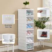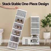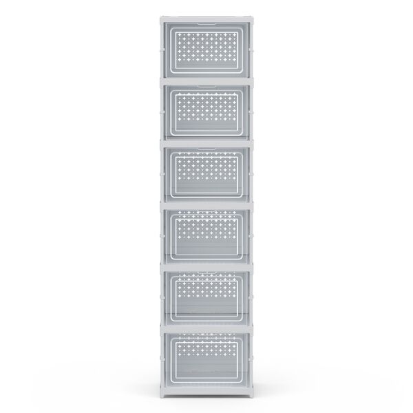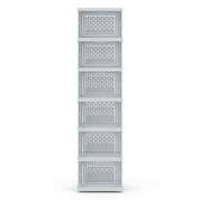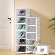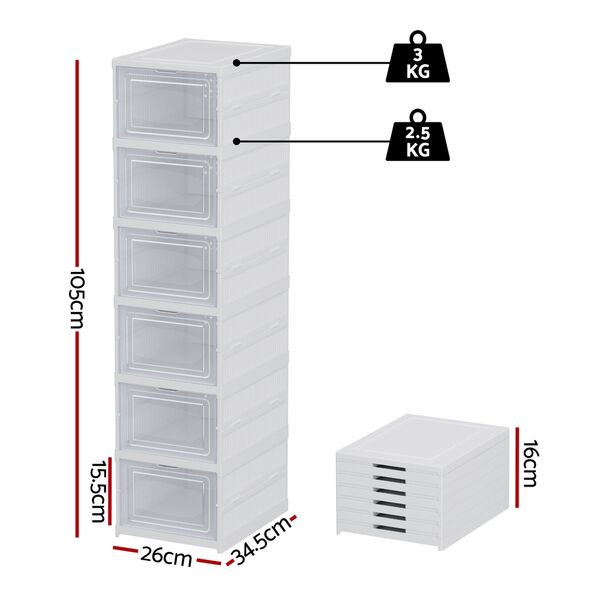 Maximise your space with this versatile shoe rack! Crafted from durable PP plastic, this 6-tier organiser offers clever shoe storage for entryways, cloakrooms, or garages. The innovative foldable design features a one-piece frame for quick setup, breathable back flaps, and see-through doors with raised handles for easy access. Each compartment holds up to 2.5KG, providing practical shoe box storage without sacrificing style. Perfect for small homes! Dimensions: 25.5x34.5x105cm. White. Assembly required (1 package).