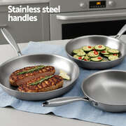 The Stainless Steel Frypan Set offers professional-grade performance with two versatile sizes (25cm and 30cm) perfect for everyday cooking. Crafted with tri-ply construction featuring a stainless steel 304 cooking surface, aluminum core, and steel, these pans provide exceptional heat distribution and retention. The uncoated stainless steel interior ensures healthy chemical-free cooking while remaining durable and easy to clean. Cool-touch stainless steel handles provide comfortable grip and stay cool during use. Suitable for all stovetops including induction, this elegant silver set combines functionality with timeless style for the modern Australian kitchen.