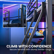 Underneath, you've got a full-size desk with a carbon fiber style desktop. The clean, no-fuss design fits right in - whether your walls are covered in posters, LEDs, or both. A solid, fixed ladder means no shaky midnight climbs when you're rushing back from a respawn.
