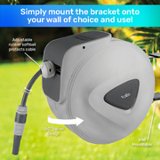 Garden Greens Ideal for all your watering needs is this mountable and retractable hose reel. 20 metres in length, it is perfect for all your watering needs.