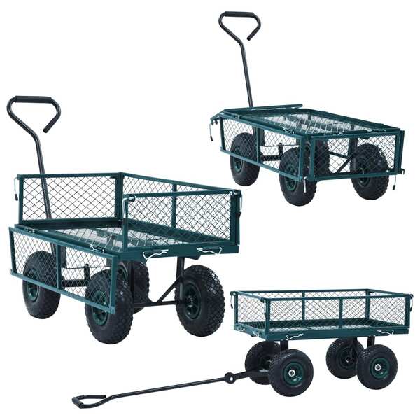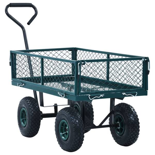 Featuring a durable and robust steel construction, this hand trolley is ideal for an array of gardening tasks. Made of heavy-duty steel, this garden cart is exceedingly stable and durable. With a maximum load capacity of 250 kg, the hand truck can easily transport flowers, leaves, logs and other stuffs. The sides panels can be opened with quick-release fasteners for easy loading and unloading. Additionally, the large heavy-duty pneumatic wheels allow you to effortless pull the trolley on uneven terrain surfaces. Padded handle ensures a firm grip as well. Please note that it is not suitable for transporting children. The garden cart liner is not included in the delivery, but can be bought in our shop.