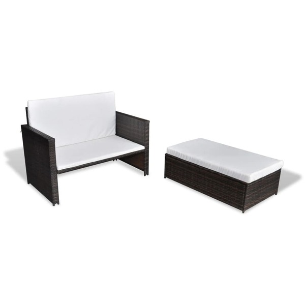 This rattan sofa set combines style and functionality, and will become the focal point of your garden or patio. The whole furniture set is designed to be used outdoors year-round. Thanks to the weather-resistant and waterproof PE rattan, the lounge set is easy to clean, hard-wearing and suitable for daily use. The seat set features a sturdy powder-coated steel frame, which is highly durable. It is also lightweight and modular, which makes it flexible and easy to move around to suit any setting. This multifunctional set can be used as a 2-seater sofa, 2-person sofa bed, or 2-seater sofa with a stool to suit any need. The backrest can be folded down to easily convert the sofa to a bed. What's more, the stool can be stored under the sofa to save space while not in use. This set is delivered with highly comfortable, thickly padded seat and back cushions. The cushion covers are removable and washable. Delivery includes a 2-seater sofa, a stool and three cushions. Note: We recommend covering the set during rain, snow and frost.