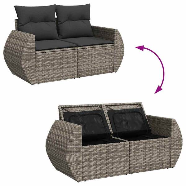 This garden sofa set is the perfect addition to your backyard, terrace, or patio, providing a comfortable and inviting space for chatting with family and friends or simply relaxing and enjoying the outdoors. Durable material: PE rattan, also known as poly rattan, is a strong, low-maintenance synthetic material that looks like natural rattan. It's lightweight, easy to clean, and commonly used for outdoor furniture due to its durability and weather-resistant properties.Storage function with water-resistant bag: The garden furniture features storage space under the seat, complete with a water-resistant bag for storing cushions, toys, and other items. The inner bag can be securely fastened to the outdoor furniture with hook-and-loop fasteners for added stability.Adjustable tabletop: The tabletop can be lifted to make the table higher, which transforms the outdoor table from a coffee table to a dining table. It's perfect for having guests over or eating meals outside.Removable and washable cover: These seat cushions feature removable covers for easy washing and maintenance.Modular design: This outdoor furniture set has a modular design, making it completely flexible and easy to move around, so you can create a customised outdoor furniture arrangement. Good to know:To make sure your outdoor furniture stays beautiful, we recommend protecting it with a waterproof cover.