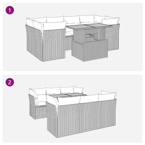 This garden sofa set is the perfect addition to your backyard, terrace, or patio, providing a comfortable and inviting space for chatting with family and friends or simply relaxing and enjoying the outdoors. Durable material: PE rattan, also known as poly rattan, is a strong, low-maintenance synthetic material that looks like natural rattan. It's lightweight, easy to clean, and commonly used for outdoor furniture due to its durability and weather-resistant properties.Storage function with water-resistant bag: The garden furniture features storage space under the seat, complete with a water-resistant bag for storing cushions, toys, and other items. The inner bag can be securely fastened to the outdoor furniture with hook-and-loop fasteners for added stability.Adjustable tabletop: The tabletop can be lifted to make the table higher, which transforms the outdoor table from a coffee table to a dining table. It's perfect for having guests over or eating meals outside.Removable and washable cover: These seat cushions feature removable covers for easy washing and maintenance.Modular design: This outdoor furniture set has a modular design, making it completely flexible and easy to move around, so you can create a customised outdoor furniture arrangement. Good to know:To make sure your outdoor furniture stays beautiful, we recommend protecting it with a waterproof cover.