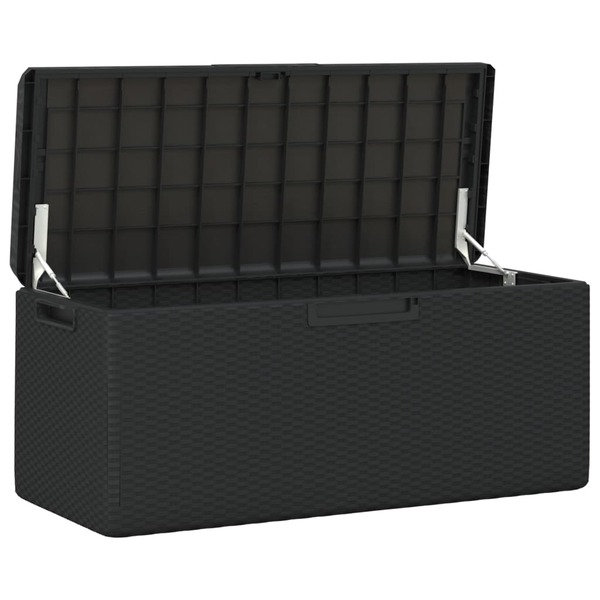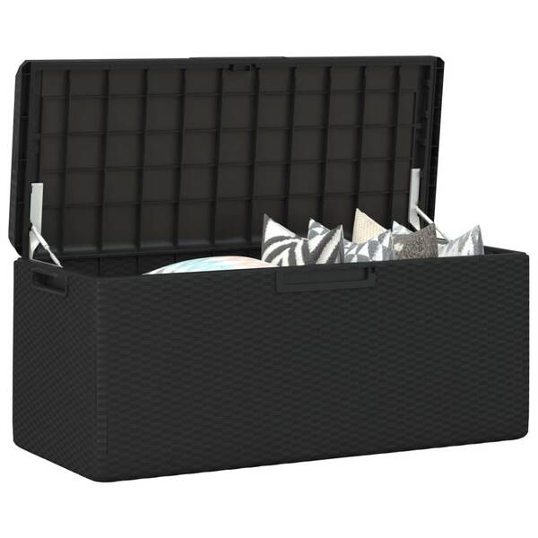 This garden storage box with a rattan look is ideal for storing your cushions, pillows, blankets, toys, and other items in the garden or on the patio. Durable material: Polypropylene (PP) is a popular plastic that is also one of the most used materials in outdoor furniture. It's lightweight, tough, and resistant to impact. Also, this storage box is weather-resistant and UV resistant, and easy to maintain. Ample storage space: This outdoor storage box has 350 L of storage space for cushions, pillows, blankets, garden tools and more to keep your garden space tidy! Multi-purpose use: This storage chest is not only used as a garden storage container, but also has a comfortable cushion with a load capacity of 250 kg, which can be used as a chair, ideal for the garden, backyard, front porch and more! Gas-lift design: The gas-lift design helps you easily open the top fully and close it slowly, making it easy to use without crushing your fingers. Lockable: This outdoor cushion storage can be locked for added safety (lock not included). Good to know:To make sure your outdoor furniture stays beautiful, we recommend protecting it with a waterproof cover.
