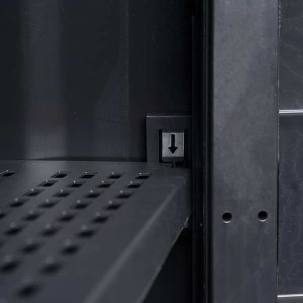 Our high-quality storage cabinet is ideal for organising and storing your household supplies, tools or other items in the garden or on the patio, etc. This cabinet will blend into any decor with its timeless design. This TÜV-GS certified cabinet is made of sturdy, durable polypropylene (PP). The storage cabinet has a ventilated shelf which can be adjusted to accommodate items of different sizes. The garden cabinet can be locked with a padlock for added safety (the lock is not included). This outdoor storage cabinet is very easy to clean. The garden cabinet has a compact design and will make the most use of limited space. Assembly is easy.