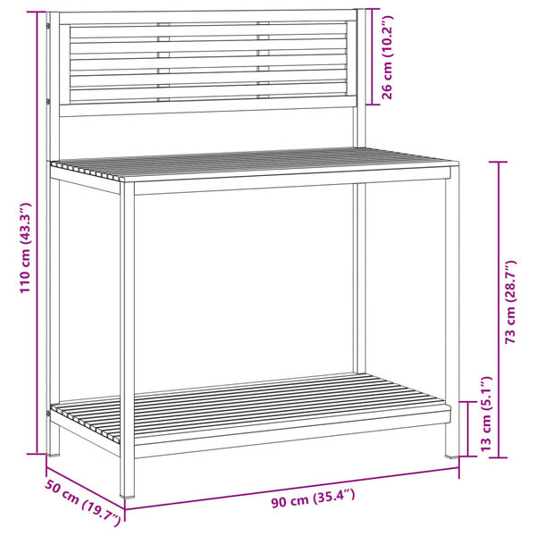 This garden work table is perfect for storage and is an ideal choice for growing a variety of flowers or plants. Stable and long-lasting frame: Solid acacia wood is known for its strength and durability. Its diverse colours and unique grain patterns give it an attractive appearance. With good stability and resistance to weathering, it is ideal for crafting indoor and outdoor furniture.Sturdy frame: The powder-coated steel frame is strong, stable, durable, and resistant to corrosion and harsh weather, ensuring long-lasting performance.Ample workplace: The powder-coated steel prep table is designed with a bottom shelf and a overshelf for customised storage space, providing ample storage space for your potting soil and plant accessories, or any other tools you may need.Practical backsplash: The backslash effectively protects your walls from scratches and dirty water, ensuring a clean and tidy garden.