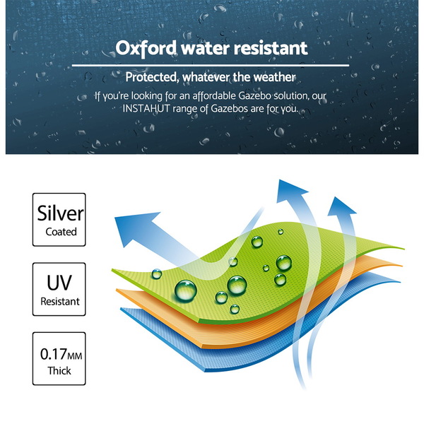 Featuring high density, long lasting silver-coated oxford fabric with effective UV and water repellent treatments, this INSTAHUT 3X6 Pop Up Gazebo provides a lovely ground and canopy coverage of 300 x 600cm. It is perfect for all your upcoming outdoor activities, as a sunshade station as well as a shelter for unexpected rains.