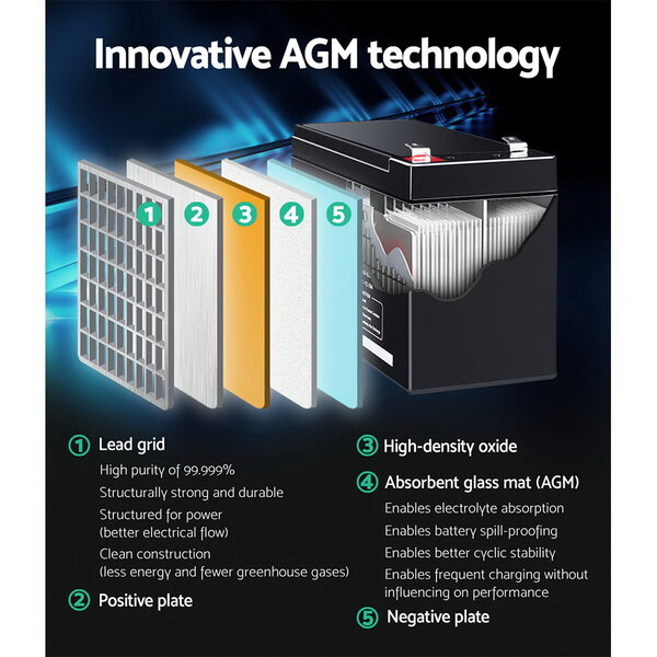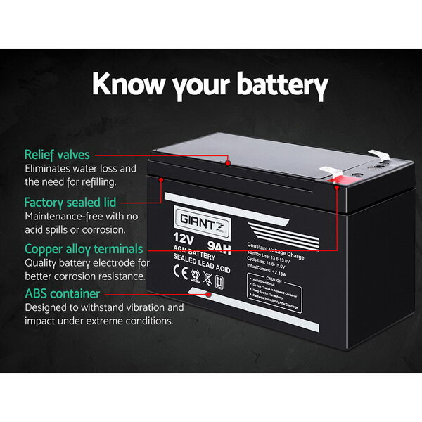 The Giantz Sealed Lead Acid (SLA) Battery is a high-energy battery that can used to power a number of equipment, including automotive, marine, medical, geographical and computer. Its unique sealed construction prevents electrolyte leakage when the battery is mounted in whatever position. The 12V battery features an incredible cycle life of up to 1200 cycles with a longer, consistent and more drawn out charge all the time. And with its advanced AGM technology, the battery enables better electrolyte absorption, cyclic stability and frequent charging without affecting performance. Better still, it has a low self-discharge rate that enables the battery to maintain up to 80% capacity even after a 12-month storage. Not least, the battery stands up to vibration well and requires little or no maintenance at all.