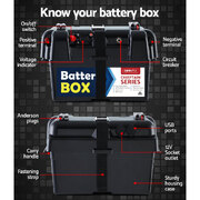 Have 12V battery will travel. With the Battery Box, there is no need to limit yourself to one location or one purpose for your deep cycle battery. The box can easily fit any deep cycle battery that measures 35cm x 18cm x 23cm and turn it into a great power station. You can power up a host of devices including camping lights and portable fridges with its cigarette lighter socket as well as mobile phones and tablets with the two USB ports. The box itself can be charged using solar panels or any power source with its quick-connect Anderson plugs. Better still, the box comes pre-wired, so all you need to do is to connect to the deep cycle battery terminals and it is good to go. The box is strong and sturdy with a built-in voltage indicator and circuit breaker for safe and hassle-free use.