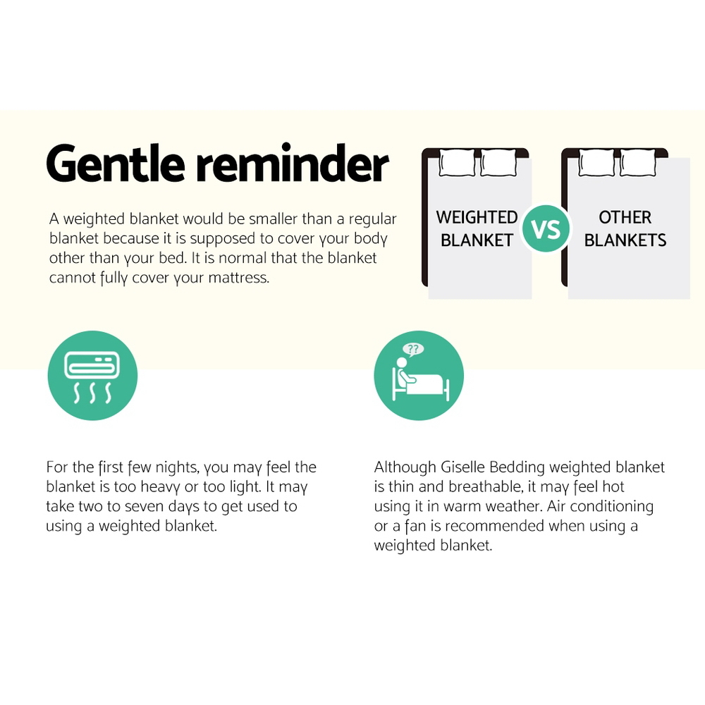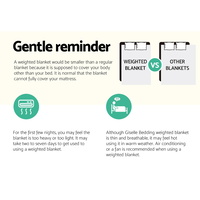 The science behind better sleep lies with a Giselle Bedding Weighted Blanket. It uses the therapeutic power of Deep Touch Pressure Simulation (DTPS) to stimulate pressure points throughout the body, thereby contributing to enhanced sleep, mood and relaxation. Our weighted blanket is engineered to be between 8% and 15% of your body weight to relax the nervous system by simulating the feeling of being hugged or held. This boosts serotonin and melatonin levels and decreases cortisol levels improving your heart rate and blood pressure. In short, you get healthier sleep and awake feeling refershed and re-invigorated. Made of 100% microfibre for both sides, the weighted blanket is filled with polyester and glass beads to create the right amount of pressure for a soothing hugging sensation. The weighted blanket is also close-fitting and conforms to your body shape and adapts to any sleeping posture easily. Not least, its excellent leak-proof stitching and 5-layer comfort ensures that the weighted blanket is ever so durable and comfortable with every use. The weighted blanket is machine washable for total convenience.