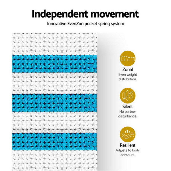 Pamper yourself with our Giselle Bedding Ronnie Series Euro Top Mattress that will give you a soothing sleep night after night. Built upon layers of quality materials, the 34cm thick mattress is a testament to fine craftsmanship and innovative sleep technology. You will find everything you desire for a mattress. Ultra-comfort with its soft and smooth Belgium knitted fabric. Comprehensive support from its genuine 7-zone EvenZon pocket springs system with zero partner disturbance. Quick recovery, even support and better ventilation with its high-density egg-shaped foam. Temperature regulation from the breathable gel-infused memory foam that keeps you cool throughout the night. Our mattress delivers all the above with a level of comfort that surpasses expectations and a medium firmness that many Australians love. Not least, the mattress is hygienically constructed to free your body from allergens and dust mites. Better sleep is not just a dream. It is a reality with our luxurious Euro Top mattress.