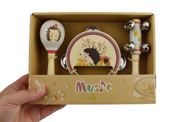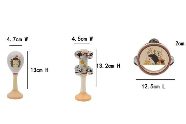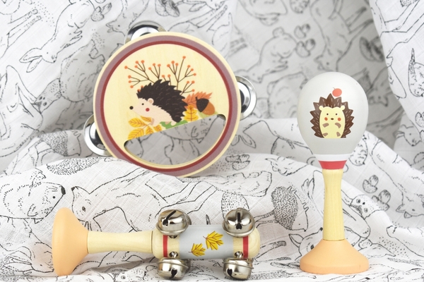 The perfect boxed set of 3 musical instruments featuring cute woodland Hedgehog design from Calm & Breezy by Kaper Kidz.