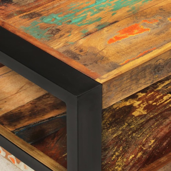 Add a touch of elegance to your living room with this stylish coffee table. Solid reclaimed wood: Solid reclaimed wood consists of reused timbers such as teak, mango wood, pinewood, and beech. These materials are recycled from old buildings such as factories, sheds, and boats. As every piece is handmade.colours will vary for each product.Metal feet: The metal feet ensure sturdiness and stability for the side table.Practical design: This practical accent table has 2 layers, providing ample space for placing multimedia appliances, books, magazines, or small objects you'd like to keep within reach. Good to know:Colours and grains vary per furniture item, making each piece unique. The delivery is random, ensuring the exclusivity and individuality of your product.
