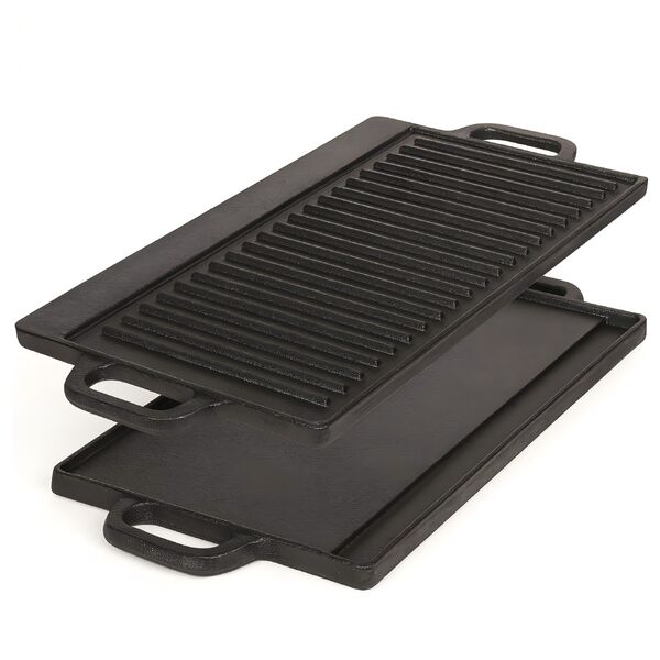 40 cm reversible cast iron grill & griddle -dual-sided (flat & ribbed), pre-seasoned, handles, for stove-top & outdoor use