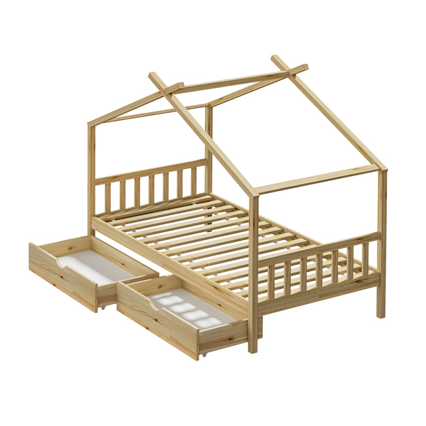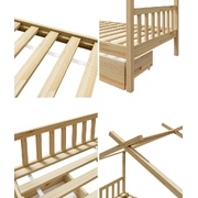 Constructed of natural solid pine wood, the reinforced frame is strong and durable with smooth edges for safe use. The finishing is meticulous SGS-approved paintwork to ensure your child is never at risk with any undesirable substances. Plus, being made close to the ground, the bed base allows for hassle-free egress and exit and prevents any unfortunate incidents. And with its two drawers with rollers integrated into the overall bed frame design, you can conveniently store away all your child favourite toys and other bedroom essentials neatly and with minimum fuss. Not least, the bed frame is made to fit an Australian-size single mattress perfectly. Just put on your child's current favourite mattress or purchase a new one from us separately.