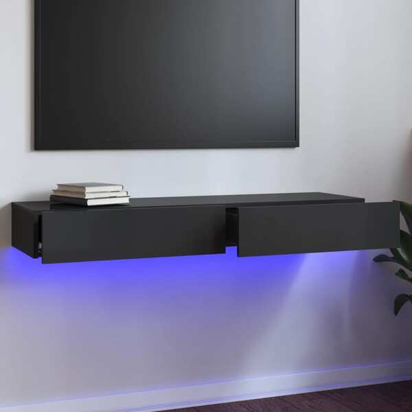 Featuring a trendy yet practical design, this TV cabinet with LED lights will definitely become a focal point of your room. Durable material: The engineered wood is of exceptional quality with smooth surface and also features strength, stability and resistance to moisture.RGB LED lights: This TV stand features RGB LED lights, which has different menus to change the colour of lights and let the colour adjust automatically differently. Ample storage space: The cabinet is designed with two drawers to keep things organised and within easy reach.Easy to clean: Additionally, this TV unit is easy to clean with a damp cloth. Note: Each product comes with an assembly manual in the box for easy assembly.The product has a USB connector, but the certified 5V USB power source is not included.Screw(s) and plug(s) for inside the wall are not included. Seek and use screw(s) and plug(s) suitable for your walls. If you are uncertain, seek professional advice. Read and follow each step of the instruction carefully.