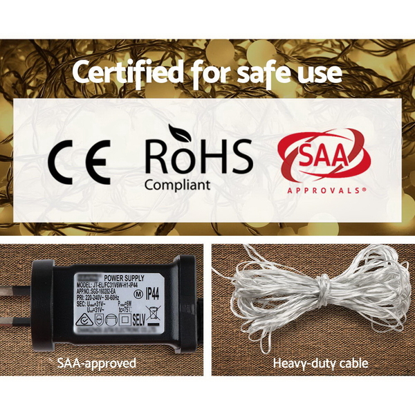 Featuring eight special lighting modes with memory functions, the quality-made 600 LED lights are equidistantly spaced out along the String for even light distribution with a working lifespan of up to 25,000 hours. They are certified safe for all-weather use for both outdoors and indoors and comes with a SAA-approved adaptor and controller. Better still, they consume little energy courtesy of the efficient LED bulbs, and remain cool to the touch always.