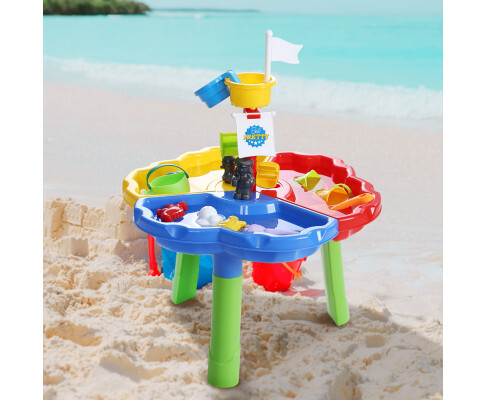 Your children will simply love our Sand and Water Table! With lots of individual pieces and many moving parts, the sand and water table takes your kids into a world sand and sea. Suitable for children three years and older, the sand and water table is designed and made in accordance with EN71 Safety of Toys certification standards. That means it is completely safe for your children with total peace of mind. Not least, the toy is also made of non-toxic and eco-friendly materials. Set it up in the backyard or bring it to the beach, the sand and water table's three-legged design ensures the assembly stays firm and steady on both sand and water despite its light weight. Your children will have a whale of a time playing with the waterwheel, rainy cloud and more. Better still, use the table and sand mould to create sandcastles for more whimsical imaginations. Neatly packaged in a colourful box, the sand and water table is the perfect gift for the season or any birthday event.