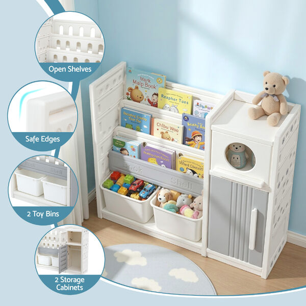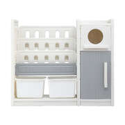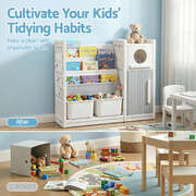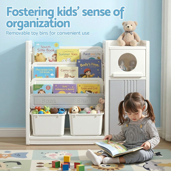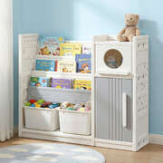 Make playtime and reading time more organised with this premium kids bookshelf and toy storage organiser. Designed with busy families in mind, this storage unit combines generous space, smart organisation and a child?friendly design. Three open shelves hold your child's favourite books, while two bottom removable toy bins and two door cabinets offer hidden storage for toys, games and art supplies.
