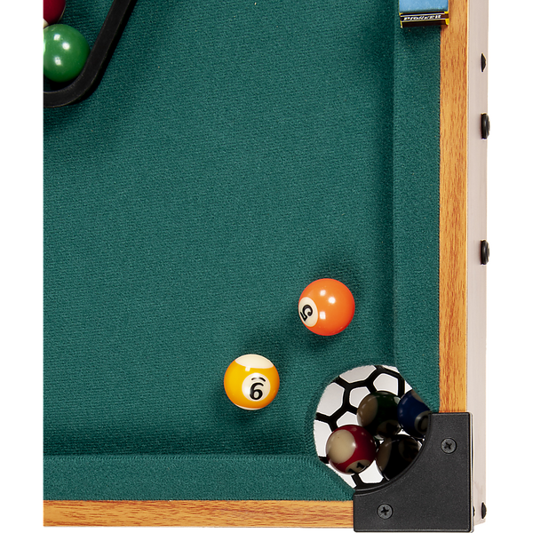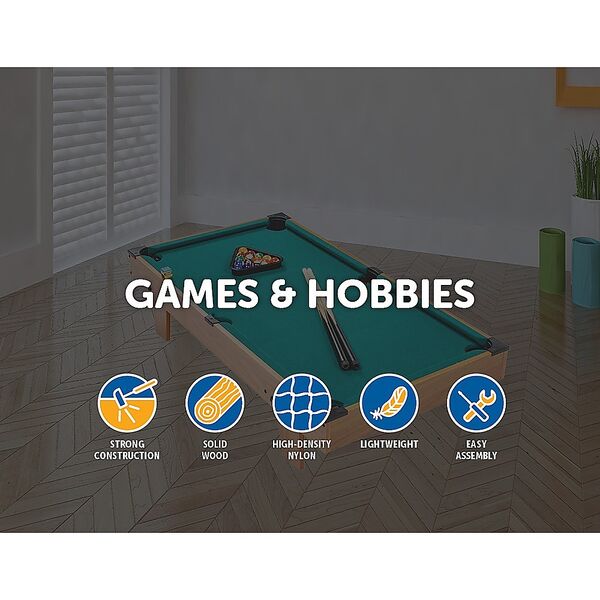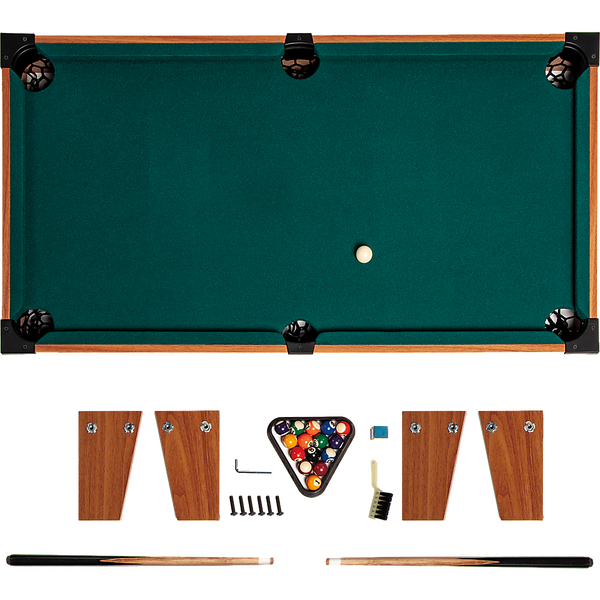 - Accessories: 2 billiard cues, 1 set of balls, and 4 table legs