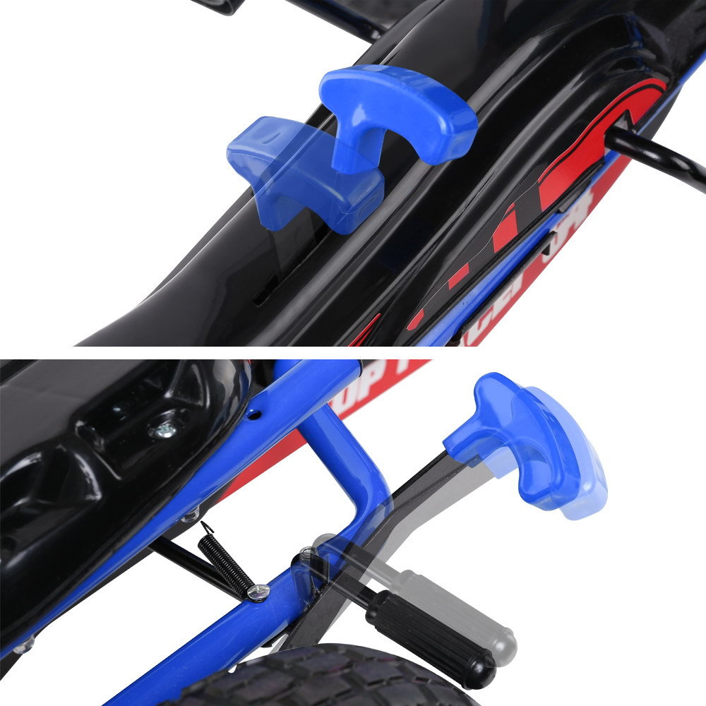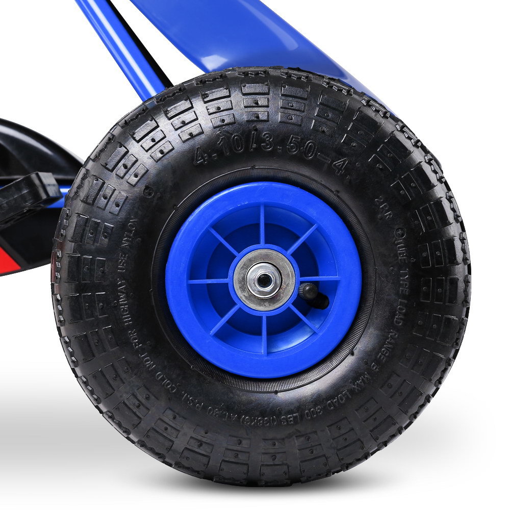 Made of a very sturdy steel frame with oxygen-welded joints for extra stability and durability, the Kids Go Kart has a large and adjustable seat with a high back rest for maximum comfort. Pedal power is assisted by a forward and reverse control and a sporty and highly responsive 3-point steering wheel. The large pneumatic rubber tyres provide good grip and traction as well as good shock absorption for a smooth ride. And for safety, the bike chain is fully covered to prevent any injury whilst the manual brake is super effective too. Not least, the striking colours and finishing simply look awesome.