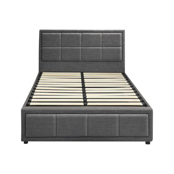 Featuring a well-padded 8-square embossed bedhead design, the Boss Bed Frame exudes bespoke elegance and adds a luxurious presence to any bedroom decor. The sophistication factor is even more prominent with the plush grey faux fabric upholstery that covers the bed frame from head to end. Soft to the touch that lends a swank and intimate aura to accompany your calm and restful sleep. But there's more to the bed frame than just an attractive appearance. The finishing is meticulous with exacting workmanship all round. Inside, the thick 13mm wooded reinforced slats provide end-to-end support for the mattress while the sturdy rubber wood legs ensure that the bed frame stands up to durable use time and again. Plus, the bed frame is definitely more than meets the eye. With its assisted hydraulic gas lift hinges, the bed can be easily brought up to reveal generous storage space for bedding and other assorted bedroom essentials. Better still, setting up the bed frame is hassle-free where the entire bed frame assembly can be completed in less than 30 minutes. The Boss Bed Frame is compatible for use with most Australian-sized mattresses and is available in King Single, Double, Queen and King sizes.