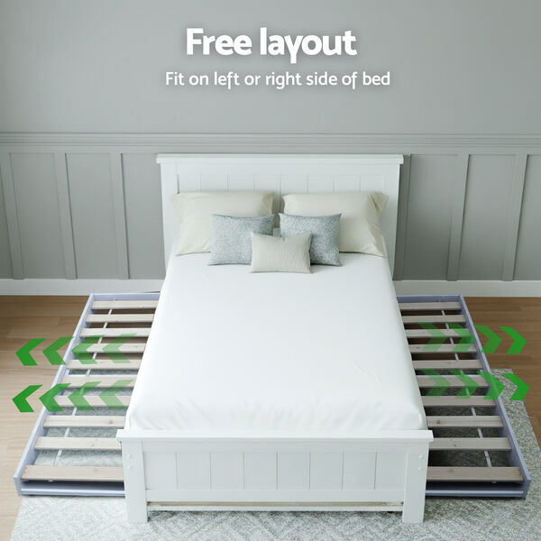 Trundle Bed: Say goodbye to space constraints with this innovative trundle bed. Perfect for homes that are always bustling with friends and family, the trundle bed conveniently stores underneath the main bed when not in use. When guests arrive, simply slide it out to reveal an extra sleeping space that's ready for use. Crafted from solid pine wood and equipped with quality timber slats, this bed frame ensures even weight distribution, offering a sturdy and reliable sleeping solution. Designed to fit standard Australian king single-sized mattresses, it guarantees minimal hassle during setup.