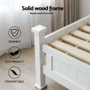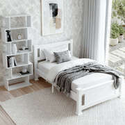 Rio Bed Frame: Crafted from natural pine wood, the Rio bed frame is a robust choice for any bedroom. Its solid timber slated base ensures lasting support, while the stylish headboard and heavy-duty steel fixings provide added stability. Finished in a non-toxic, eco-friendly white paint, this bed frame seamlessly integrates with any décor, making it an ideal centerpiece for your child's room or a stylish addition to your own space. With smooth edges all around, the Rio bed frame prioritizes safety without compromising on aesthetics.