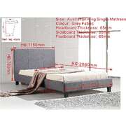This bed from the expert craftspeople at Palermo measures 115 cm wide by 206 cm long, with a headboard that measures 88 cm tall (10cm leg 78cm headboard) from top to bottom. It fits a king single mattress measuring 106 x 203 cm. The frame and headboard feature a durable Linen Fabric covering that's easy to clean and that will look great for many years to come. The headboard is padded for comfort while sitting up and reading or watching TV. An attractive stitched-together look and clean, simple lines make this bed frame a perfect complement to the modern bedroom. And the grey colour adds visual appeal without being ostentatious.