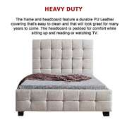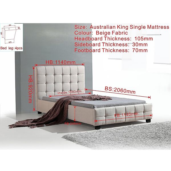 This bed from the expert craftspeople at Palermo measures 114 cm wide by 206 cm long, with a headboard that measures 88 cm tall (10cm leg 78cm headboard) from top to bottom. It fits a king single mattress measuring 106 x 203 cm. The frame and headboard feature a durable Linen Fabric covering that's easy to clean and that will look great for many years to come. The headboard is padded for comfort while sitting up and reading or watching TV. An attractive stitched-together look and clean, simple lines make this bed frame a perfect complement to the modern bedroom. And the beige colour adds visual appeal without being ostentatious.