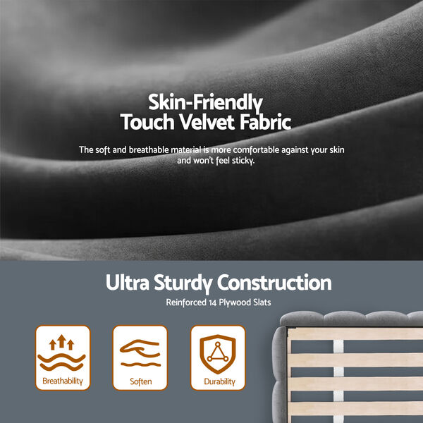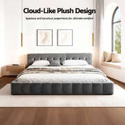 The King Bed Frame combines elegance and function with its cloud-inspired plush velvet headboard and modern platform base. Featuring a reinforced plywood-pine frame with 14 support slats and durable metal fixings, it holds 300kg and fits king mattresses (183x203cm). The smooth-edge velvet upholstery adds luxury while ensuring safety. Quick assembly completes this bedroom upgrade.