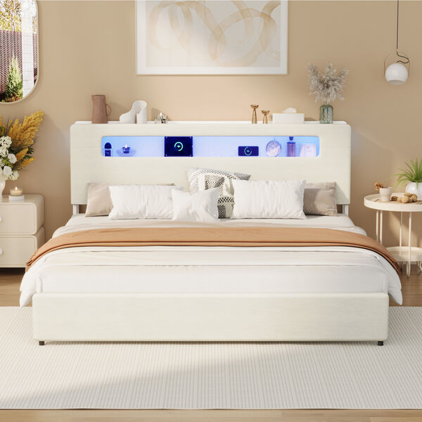 First up, the headboard and tailboard are both upholstered in a soft linen fabric for a chic and swanky vibe. And within the headboard, a storage display shelf lets you store all your bedroom essentials and anything else that meets your fancy to have at your bedside. Books, mementos, collectible or media devices. Add to that list anytime.
