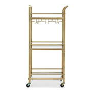 Upgrade your space with this sleek and practical gold bar cart, designed for both style and function. Featuring a durable gold metal frame and 3-tier mirrored tempered glass shelves, it offers ample storage for drinks, snacks, or decorative items. The removable wine glass rack adds versatility, while the 4 universal casters (2 lockable) ensure easy mobility and secure placement. Its curved push bar doubles as a towel rack for added convenience. Suitable for use in the kitchen, dining room, or living area, this multi-functional serving cart is perfect for hosting or daily use. Assembly is a breeze with clear instructions, and the waterproof surface makes cleaning hassle-free. Add elegance and convenience to your home today!