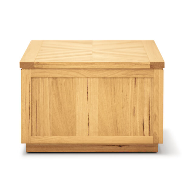 A lamp table with 1 drawer and an open shelf that immediately draws attention due to its design. The drawer box is solid timber with finger joint corners, a ply base and full extension metal runners. It solves the storage space problem and also helps in showcasing decorative items. The lovely table features Herringbone design, showcasing a beautiful geometric pattern, highlighting the natural grain of the wood, and this makes each furniture piece look unique. The table is designed in the Scandinavian-style, featuring innovative wood patterns and colour accents.It looks even more beautiful due to its natural colour with a clear lacquer finish. It also features a striking parquet top, which highlights the timber's beautiful colours and distinctive grain. The tabletop has a shadow gap which gives the appearance of a floating top, making it look amazing. The sleek lamp table is made of sustainably harvested solid and veneer messmate. A one-year warranty is included with the fully assembled lamp table.