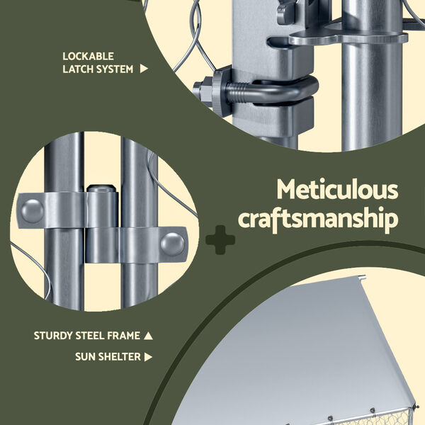 Keep your dog protected and entertained outdoors with the Outdoor Dog Kennel. This kennel is designed to withstand any weather conditions, ensuring long-lasting use outdoors. Not only is this kennel spacious and comfortable, but it also boasts a durable structure with a solid steel frame, keeping your dog safe and preventing escape. The lockable system adds an extra layer of security. With a large entrance, you and your dog can easily enter and exit the kennel without hassle. And the best part? It's incredibly easy to install, making it a convenient choice for pet owners. Give your dog the ultimate outdoor sanctuary with the Outdoor Dog Kennel!