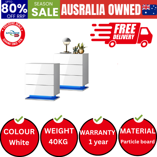 Bedside Tables Set of 2 LED Side Table Nightstand Cabinet 3 Drawers