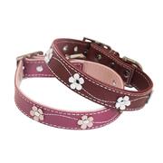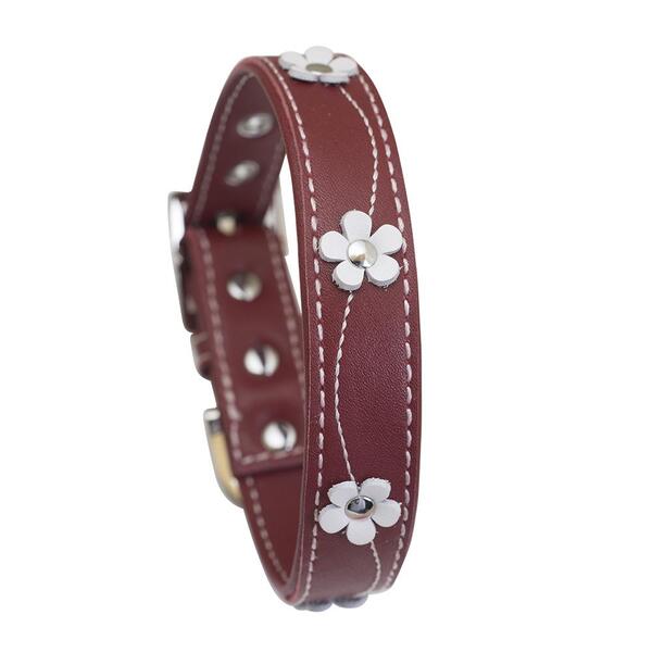 Red leather dog collar in floral design that is perfect for girls. Reminiscent of warm sunny days, the Lucy collar is decorated with the delicate flowers of spring laying softly in an undulating pattern. Contrasting white stitching complete this beautiful design.