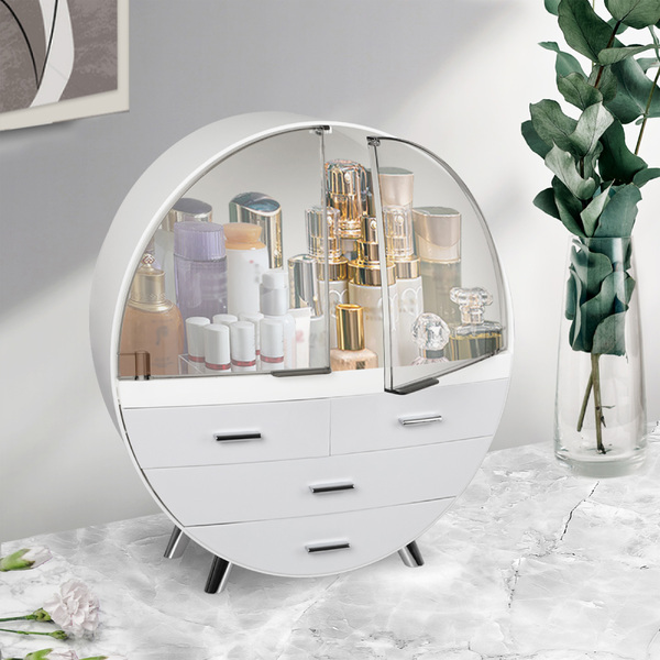 Slide out the drawers in your vanity case. Store jewellery and brushes in the drawers. Keep your lipstick, mascara, and other makeup in the tall top section. Keep your counter clear.