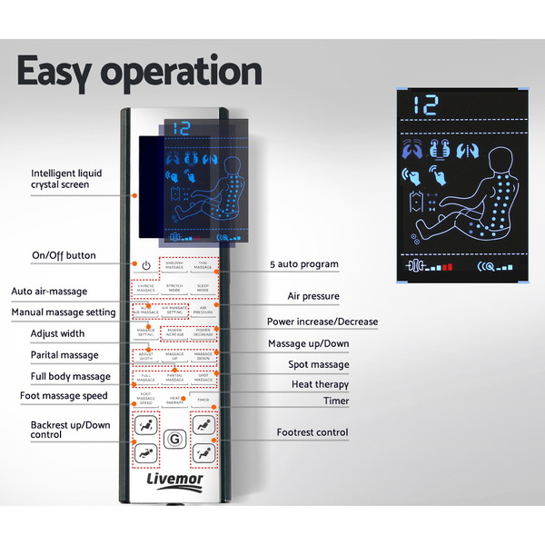 Using the latest smart massage technology, the Livemor Mirna Electric Massage Chair is designed to deliver an out-of-this-world massage experience. A deeply relaxing experience that rivals the professionals, all from the comfort of home. The extensive SL track provides a full body massage that follows the curve of your spine and extends below the thighs, leaving every muscle relaxed. The massage chair also has an automatic body scanning function that maps out the key areas of the neck and back for a consistent massage. Using 5 signature full-body automatic programs, 4 targeted modes, 3 levels of strength and speed adjustments, you can tailor the massage to your exact specifications. Not only that, but you can enjoy ultimate relaxation with a heated massage function, zero gravity position, and built-in Bluetooth speakers to listen to your favourite audiobooks and music. Why pay for the professionals when you can have the luxury of a premium massage in your living room? Get your Livemor Mirna Electric Massage Chair today.